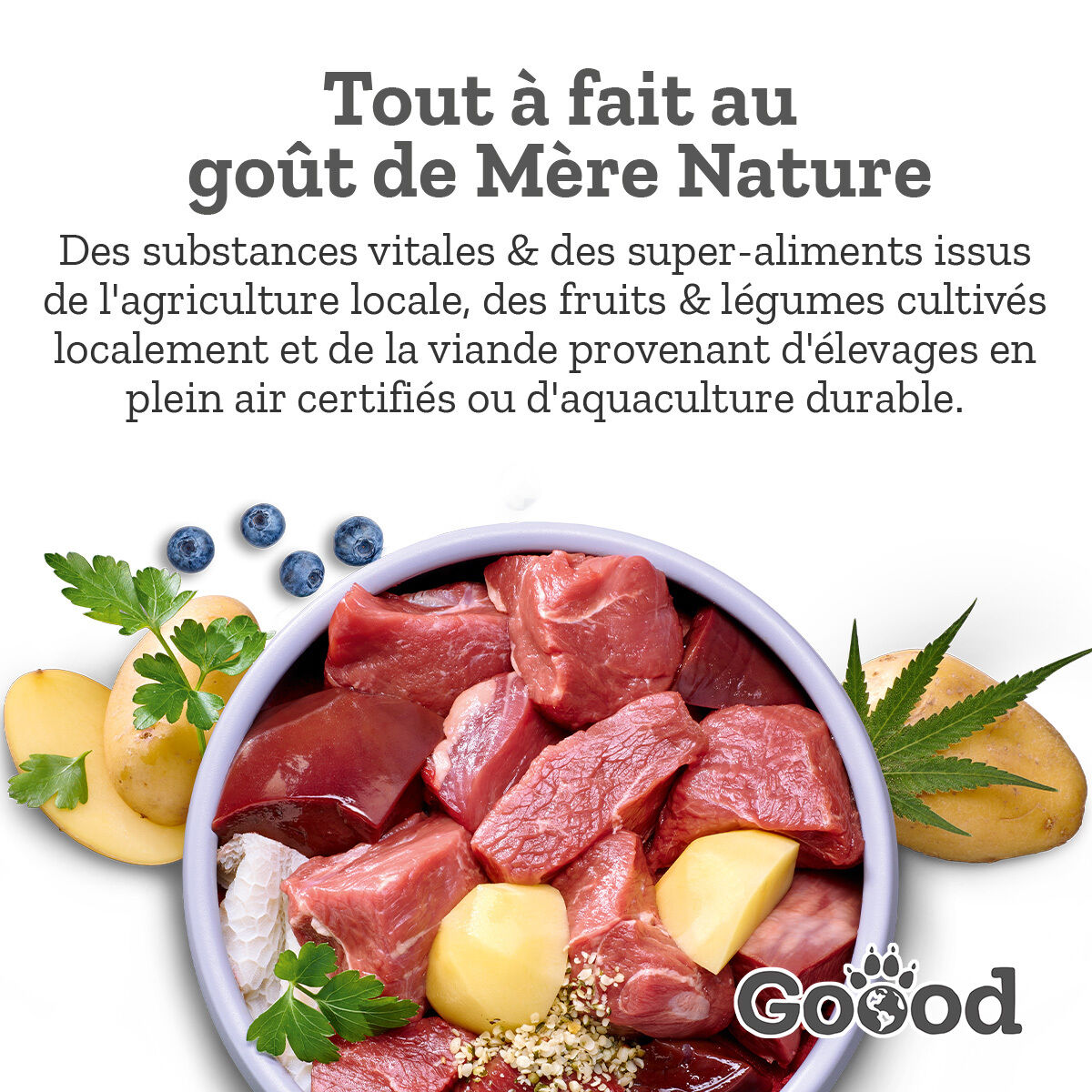 Des moutons et des agneaux vivant dans les pâturages, libres de brouter toute la journée et auxquels un abri offre une protection en cas de mauvais temps, voilà ce que nous entendons par un élevage naturel de moutons. Cela rend leur viande tendre et juteuse. Les pommes de terre et les panais sont issus de l'agriculture régionale. Cette recette sans céréales répond aux besoins des chiens de grande taille et n'a pas besoin d'ajout de sucre ou de colorants, d'arômes ou de conservateurs artificiels. Tu peux mélanger notre aliment humide avec un aliment sec ou le donner seul - il est facilement digéré et apprécié même par les chiens souffrant d'intolérances alimentaires.<