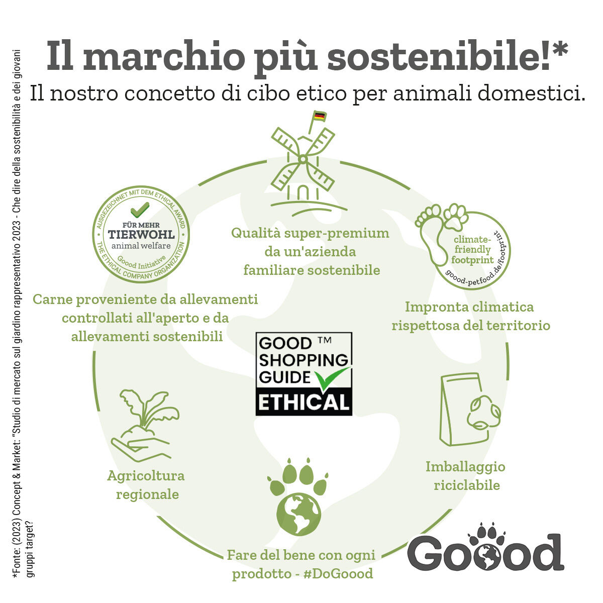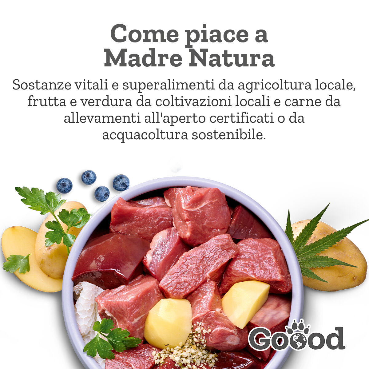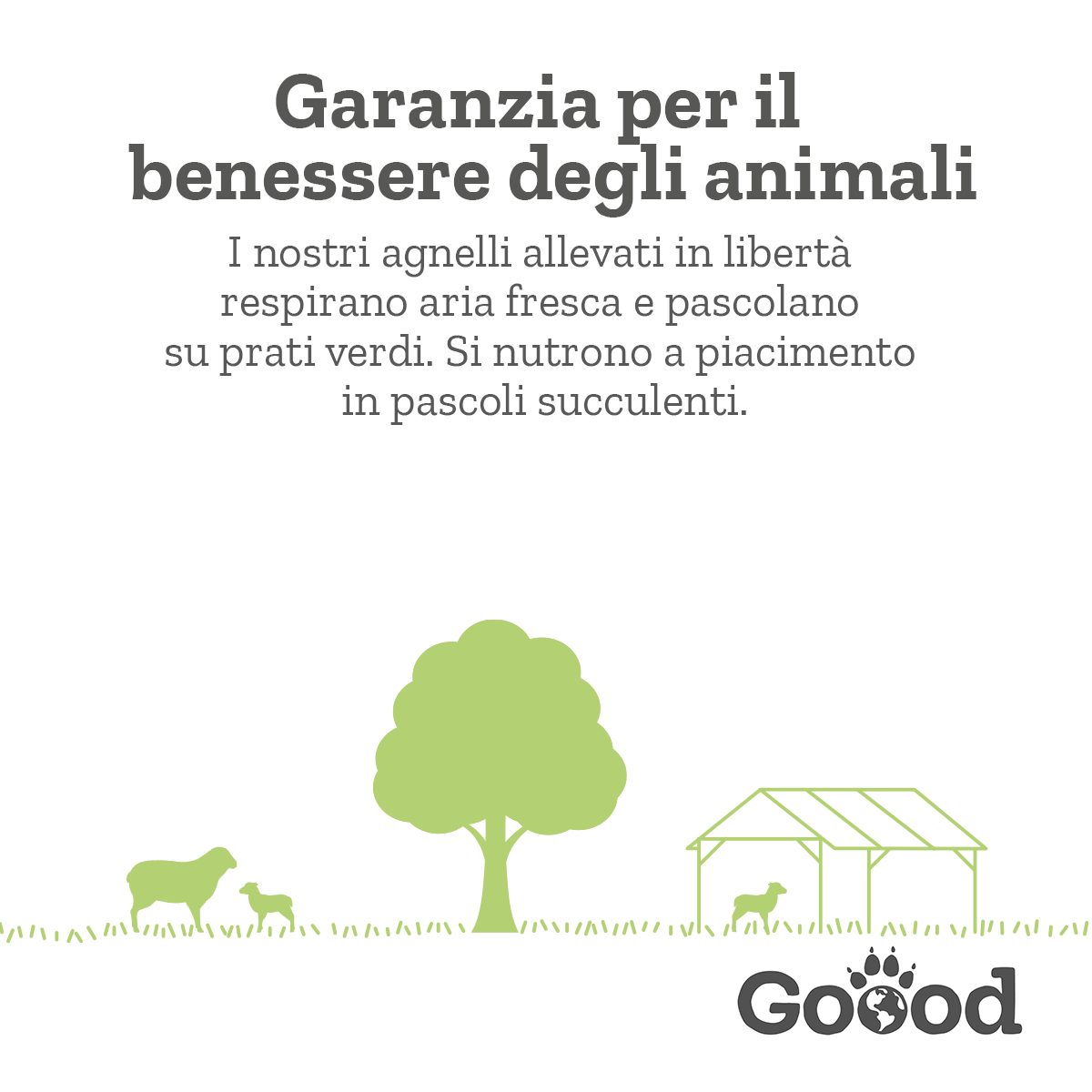 Pecore e agnelli che vivono all’aperto possono pascolare in qualsiasi momento e, in caso di maltempo, possono correre al riparo: ecco cosa intendiamo per allevamento naturale delle pecore. Questo rende la carne tenera e succosa. Le carote e la pastinaca provengono da colture regionali. La ricetta senza cereali è appositamente studiata per le esigenze dei cani di taglia grande e non ha bisogno di zuccheri aggiunti, né di coloranti, aromi o conservanti artificiali. Puoi mescolare il nostro alimento umido con quelli secchi o somministrarlo da solo: è facile da digerire e gustoso anche per i cani con intolleranze alimentari.