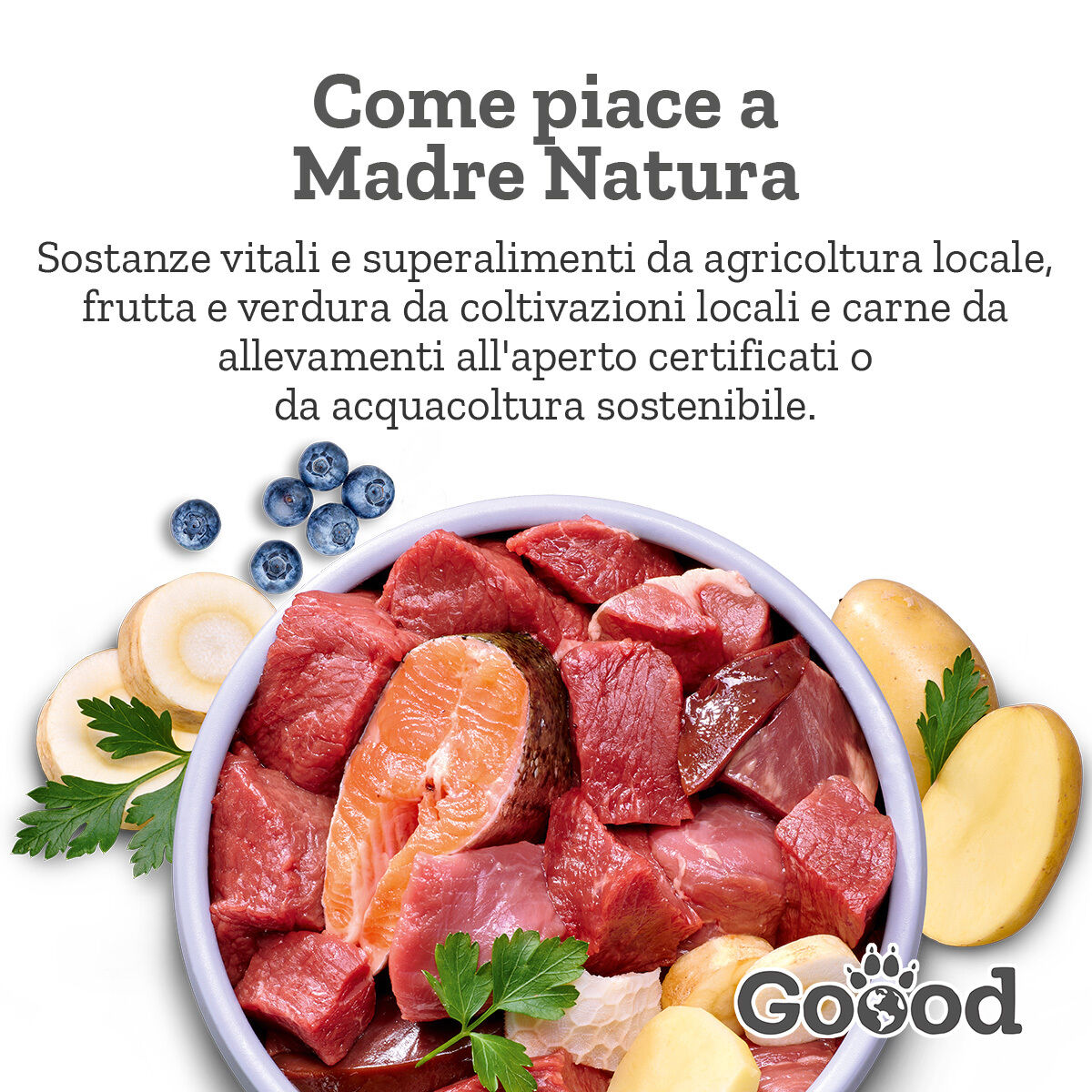 Le pecore sono animali da branco. Se allevate in modo consono alla specie, devono disporre di molto spazio e potersi muoversi liberamente. Ecco perché ci riforniamo solo di agnelli da pascolo. Le nostre trote nuotano in acque naturali e ricevono ossigeno a sufficienza per crescere sane. Manteniamo lontani da loro i fattori che causano stress, come la luce del sole o il rumore. Anche il tuo cane sentirà la differenza rispetto ad un allevamento tradizionale. Le verdure come la pastinaca e le patate provengono dalla nostra regione. La nostra ricetta è particolarmente digeribile e non contiene zuccheri aggiunti, né coloranti, aromi o conservanti artificiali ed è priva di cereali. Le proteine di alta qualità dell'agnello e della trota, le vitamine nonché lo zinco promuovono la crescita e lo sviluppo del sistema immunitario. Puoi mescolare gli alimenti umidi con quelli secchi o somministrarli da soli. Contiene tutto quanto serve al tuo piccolo tesoro per un'alimentazione equilibrata durante la fase di crescita.