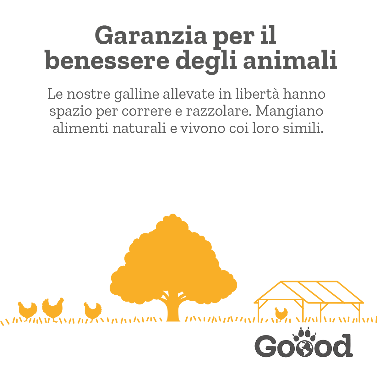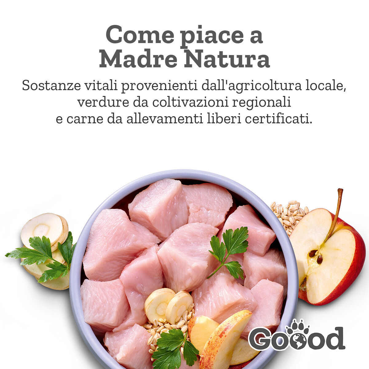 La carne di tacchino è particolarmente povera di grassi e ricca di buone proteine. E non solo fa profumare la ciotola con un tocco di natura, ma è anche molto salutare. L'allevamento di tacchini all'aperto è una nicchia in Germania. I tacchini hanno più spazio e opportunità di razzolare rispetto all'allevamento convenzionale. Orzo e pastinaca provenienti da colture regionali completano la ricetta naturale, che non necessita di zuccheri aggiunti né di coloranti, aromi o conservanti artificiali. Inoltre, la carne di tacchino e la pastinaca favoriscono la digestione e il metabolismo. Il nostro alimento umido Goood è preparato con ingredienti di alta qualità e fornisce al tuo amico a quattro zampe tutti i nutrienti importanti di cui ha bisogno per un'alimentazione idonea alla specie. Puoi mescolare il nostro alimento umido con quelli secchi o somministrarlo da solo: