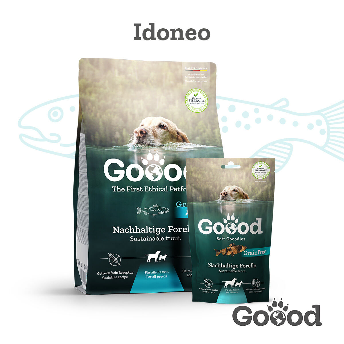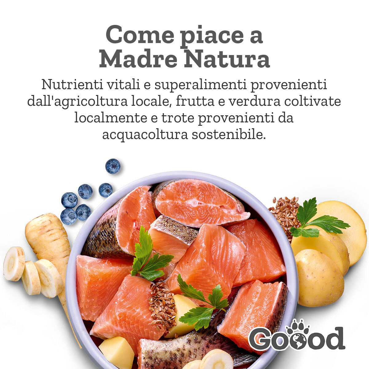 Per assicurare il benessere delle trote, i nostri allevatori garantiscono un'elevata qualità dell'acqua ed evitano lo stress, come ad esempio la forte luce solare. È così che ricaviamo il delizioso e salutare filetto di trota per il nostro alimento per cani Goood. È inoltre arricchito con verdure provenienti da colture regionali e prezzemolo. La nostra ricetta senza cereali non necessita di zuccheri aggiunti, né di coloranti, aromi o conservanti artificiali, ed è anche ben tollerata dai cani con stomaci sensibili e intolleranze alimentari. Gli acidi grassi omega-3 e omega-6 del pesce e dei semi di lino sono ottimi per la pelle e il pelo. Puoi mescolare il nostro alimento umido con quelli secchi o somministrarlo da solo: