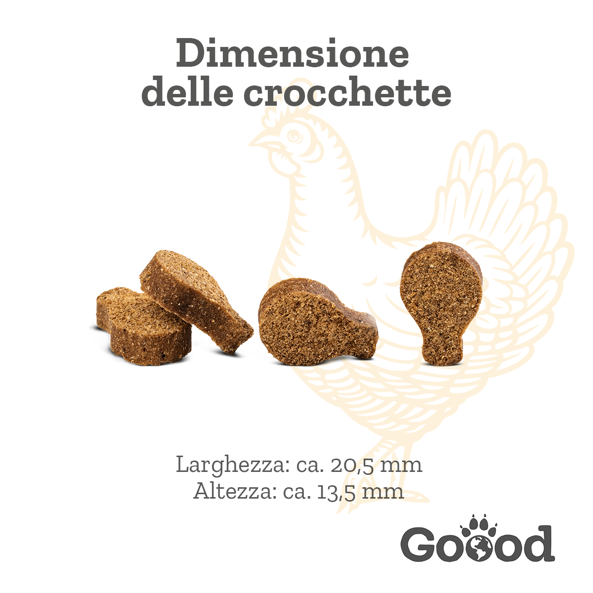 - 73 % di contenuto di carne originale (in 1 kg di alimento secco ci sono 730 g di carne di pollo).