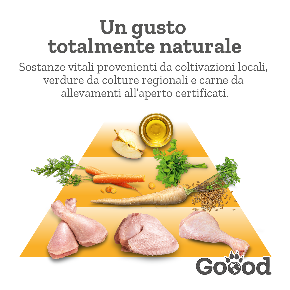 I nostri polli di allevamento all'aperto sono nutriti solo con alimenti naturali. La qualità che si assapora. È arricchito con preziosi cereali integrali che forniscono energia tra un pasto e l'altro. I nostri Soft Gooodies sono facilmente digeribili. Per principio, non utilizziamo additivi come zucchero, coloranti, aromi o conservanti artificiali. Preferiamo affidarci agli effetti naturali di ingredienti di alta qualità. I bocconcini a forma di piccole cosce con pollo e pastinaca di Goood favoriscono la digestione e il metabolismo.