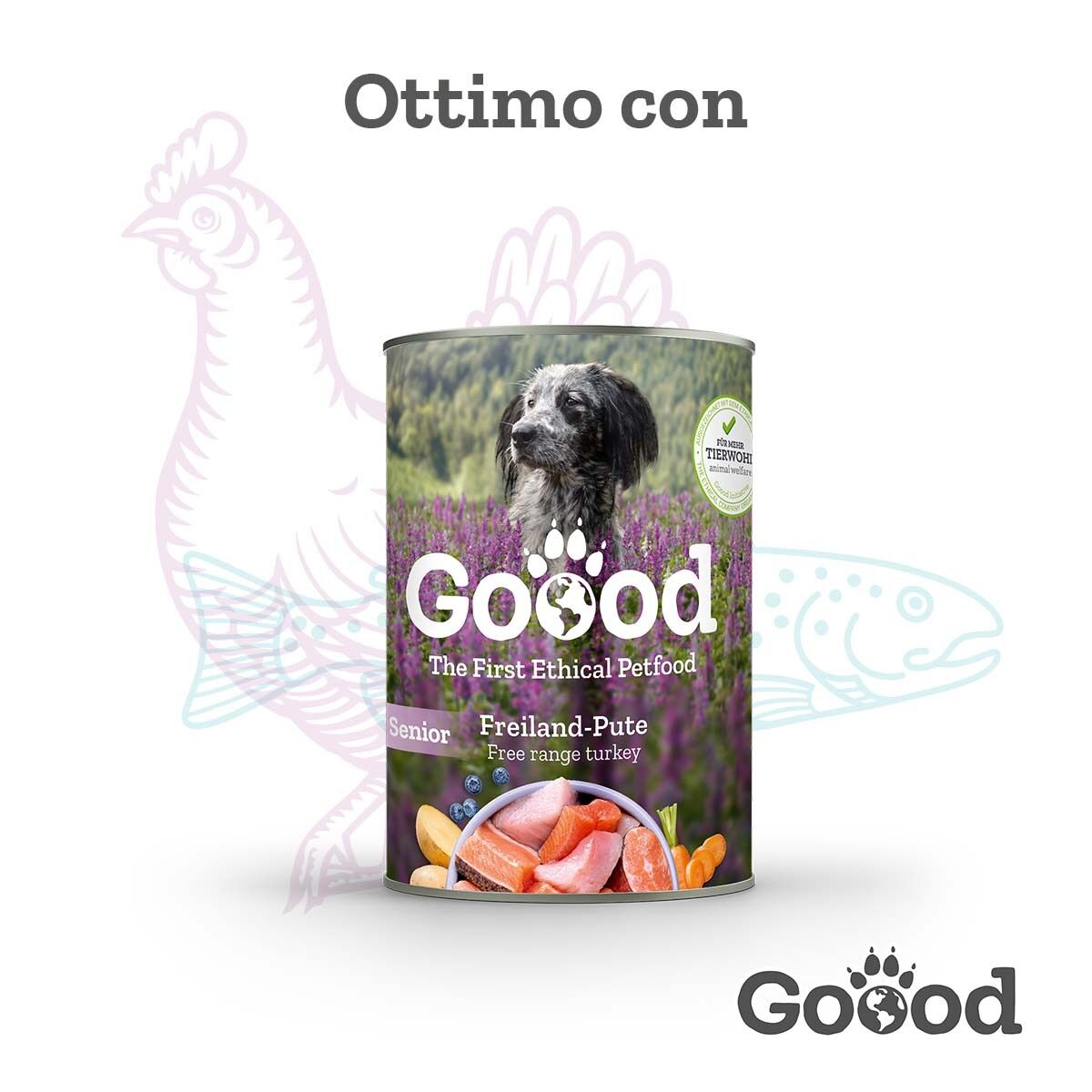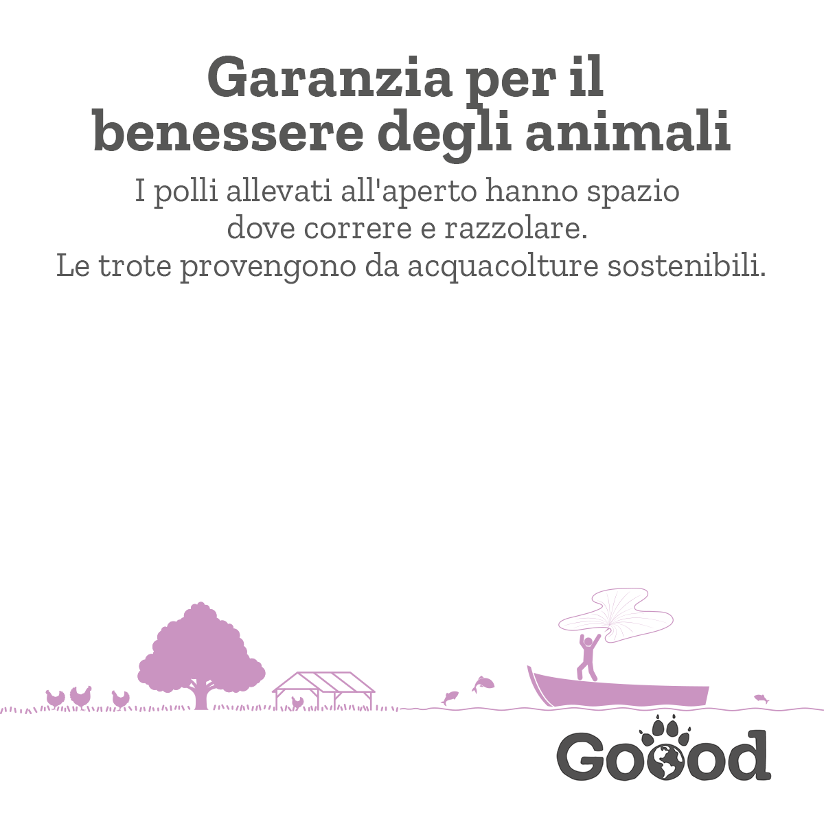 In natura i polli passano la gran parte delle loro giornate a razzolare e beccare. Proprio come i nostri polli da allevamento all’aperto. La carne di pollo è ricca di proteine e ferro e la trota contiene molti acidi grassi essenziali. Inoltre, contiene patate, carote e pastinaca provenienti da colture regionali. La ricetta altamente digeribile è appositamente studiata per le esigenze dei cani anziani ed è ben tollerata anche dai nostri amici senior sensibili che soffrono di intolleranze alimentari. Questo alimento completo, gustoso e digeribile, con un tenore ottimale di proteine, fosforo e sodio, protegge gli organi e garantisce vitalità e gioia di vivere anche in età avanzata. Per principio, non utilizziamo additivi come zucchero, coloranti, aromi o conservanti artificiali. In questo modo il tuo amico a quattro zampe avrà tutto ciò di cui ha bisogno per una vita sana, anche in età avanzata.