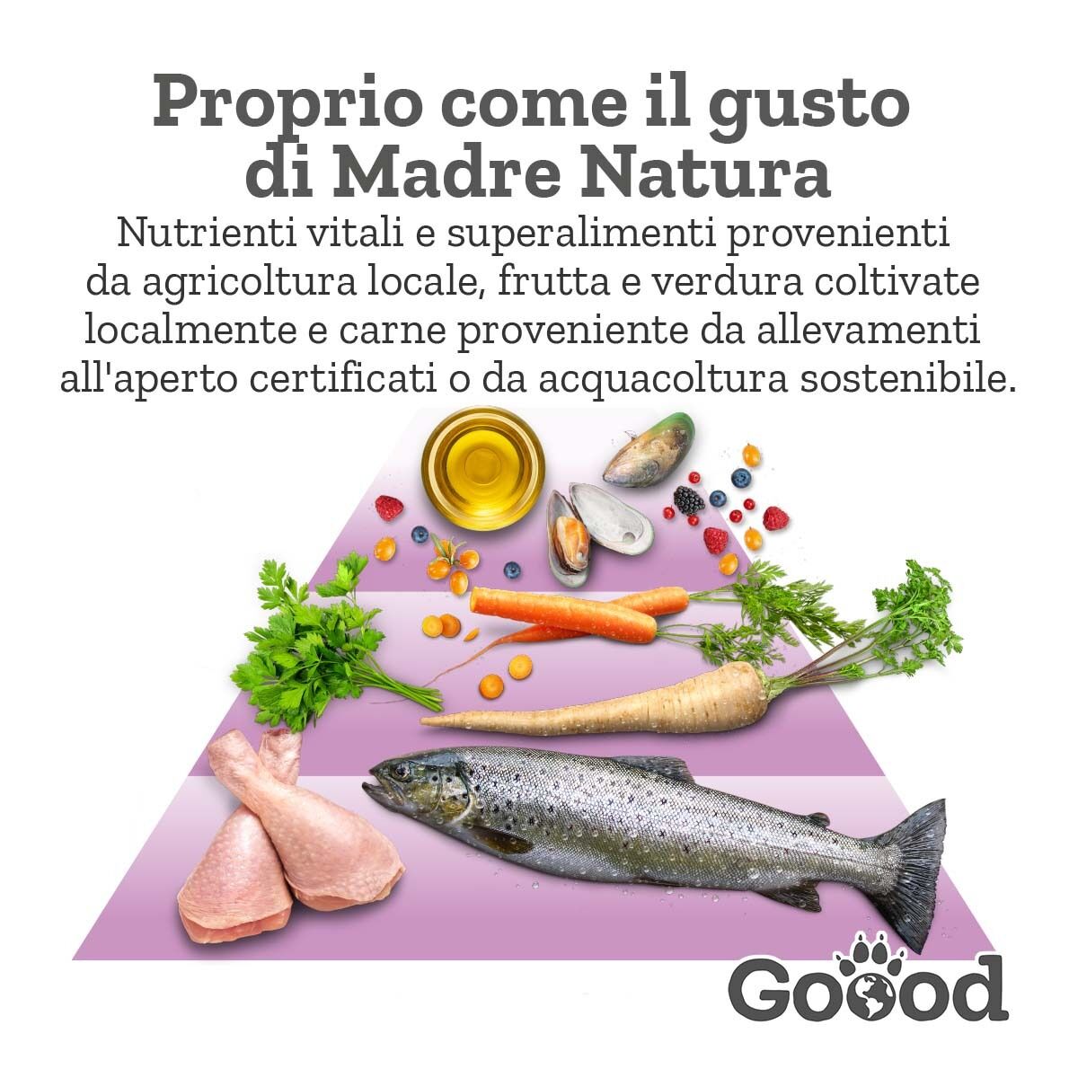carne di pollo da allevamento all’aperto* (16,5 %), patata essiccata (16,5 %), granturco integrale, orzo integrale, farina di frumento, farina di trota da acquacoltura sostenibile (4 %), grasso di pollame, polpa di barbabietola pressata e melassata* (senza zucchero), fegato idrolizzato, olio di semi di girasole (1,6 %), proteine della patata*, polpa di mela pressata*, olio di colza, cloruro di sodio (da sale marino), carote* (0,3 %), pastinaca*, prezzemolo a radice*, lievito* (estratto, 0,2 % = 0,04 % di mannano-oligosaccaridi), cicoria in polvere (0,15 % = 0,01 % di inulina), foglioline di prezzemolo*, polvere di molluschi (0,1 %), glucosamina (0,1 %) (mix di verdure regionale totale 1 %);
